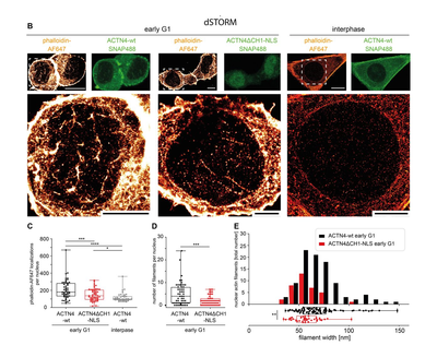 One of the most important processes in cell development is cell division. In a joint project led by Prof. Dr. Robert Grosse in Freiburg, Germany, we were part of the research team that now discovered that bundled fibers of actin within a cell nucleus play an important role in how cells enlarge after division: After division, cell nuclei must grow in order to reorganize and unpack the genetic information to process and read it. With this work, we show that bundled fibers of actin – which are normally responsible for exerting force – work within the cell to expand the cell nucleus. The results are now published in EMBO reports.