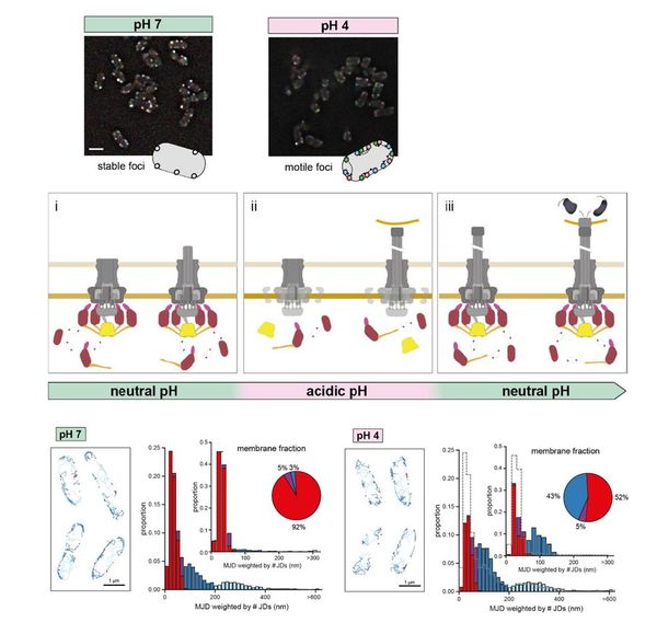 Our research collaboration led by Andreas Diepold at the Max Planck Institute for Terrestrial Microbiology now has revealed that this dynamic behavior allows the bacteria to quickly adapt the structure of their needle systems to external conditions: We were able to show that a T3SS protein in the cellular membrane functions as a pH sensor and, in an acidic environment like the stomach, becomes motile (as seen in the picture: the dark blue fraction of the motility distribution becomes prominent when the bacteria are exposed to acidic conditions.).