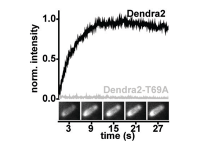 German version Ein allgemeiner Mechanismus der Photokonvertierung von grün‐zu‐rot fluoreszierenden Proteinen unter blauem und infrarotem Licht reduziert Phototoxität in der Einzelmolekülmikroskopie von lebenden Zellen.