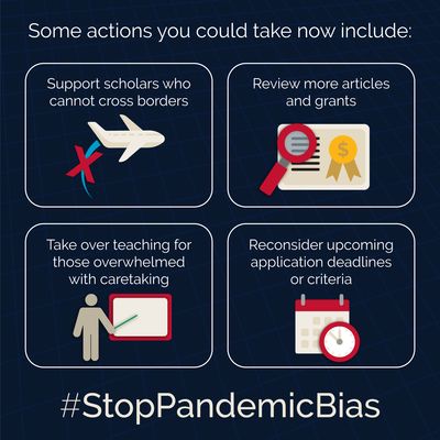 Being unaffected by COVID-19 is a new privilege. The disadvantaged are among both the applicants for positions, grants and publications and their selecting peers, and their voices currently are not heard in our community. Pandemic bias will hinder or even stop the careers of many in our community and prevent access to many trying to enter scientific research. Science is inherently cooperative: we work in teams comprising all career stages; we make discoveries in international collaborations; we evaluate each other’s ideas. All of us need to contribute, & all of us have something at stake. Now is the time to act. There is no silver bullet, but we all have numerous points of direct influence. Some actions you could take now, depending on your position include: support scholars who cannot cross borders; review more articles and grants; take over teaching for those drowning in care; or reconsider upcoming application deadlines or criteria. We feel that there are more opportunities for significant change and we need to start the conversation now.